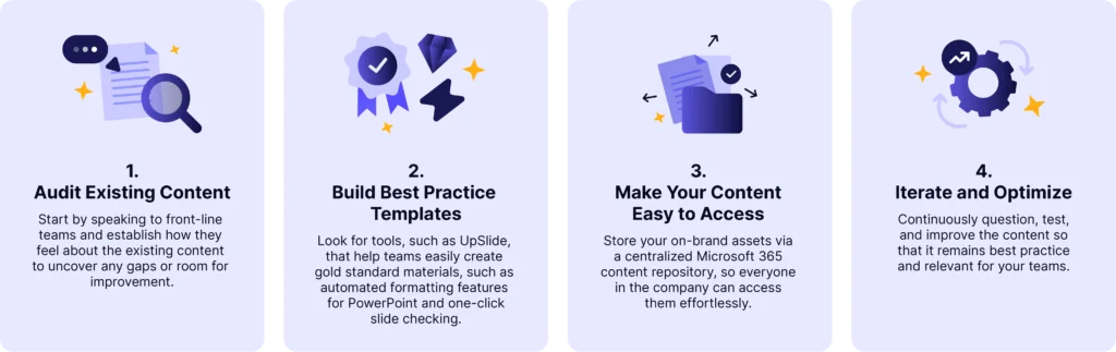 To implement your strategy: audit current content, create best-practice templates, centralize storage, and continuously iterate for improvement.
