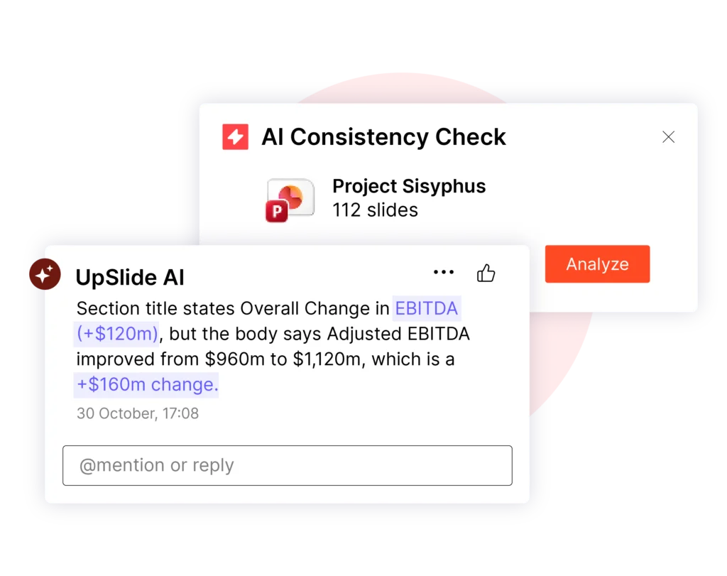 Consistency Check spécialement conçu pour les services financiers et comprend parfaitement les documents financiers complexes tels que due diligence , les mémorandums d'investissement et les rapports de fonds. Cela signifie qu'il détecte les erreurs qui comptent vraiment : les mesures récurrentes, les calculs et la cohérence narrative entre les diapositives.