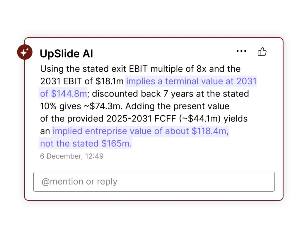 AI Consistency Check est un outil de relecture et d'audit assisté par l'IA qui détecte automatiquement les incohérences, les erreurs de calcul et les contradictions narratives dans les présentations et les documents financiers, directement dans PowerPoint. Il est conçu pour les équipes financières qui produisent des mémorandums d'investissement, des rapports de Due Diligence, des pitchbooks et d'autres documents à fort impact.