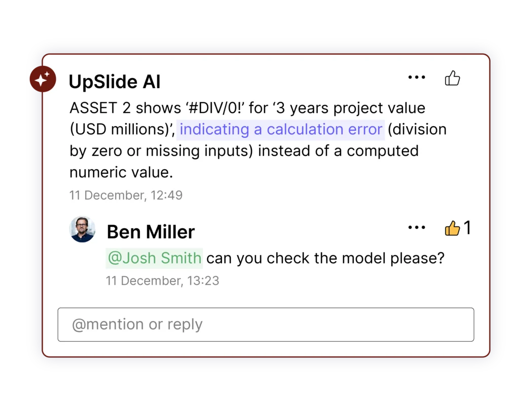 Le Consistency Check s'appuie sur plusieurs modèles d'IA pour analyser les chiffres, les commentaires, les tableaux, les graphiques et le texte de votre présentation, quel que soit leur format (image, tableau lié ou texte). Il met en évidence les chiffres incohérents, les commentaires contradictoires et les divergences de calcul dès le début du processus de révision, afin que les équipes corrigent les problèmes avant qu'ils n'impactent les décisions ou la révision externe.